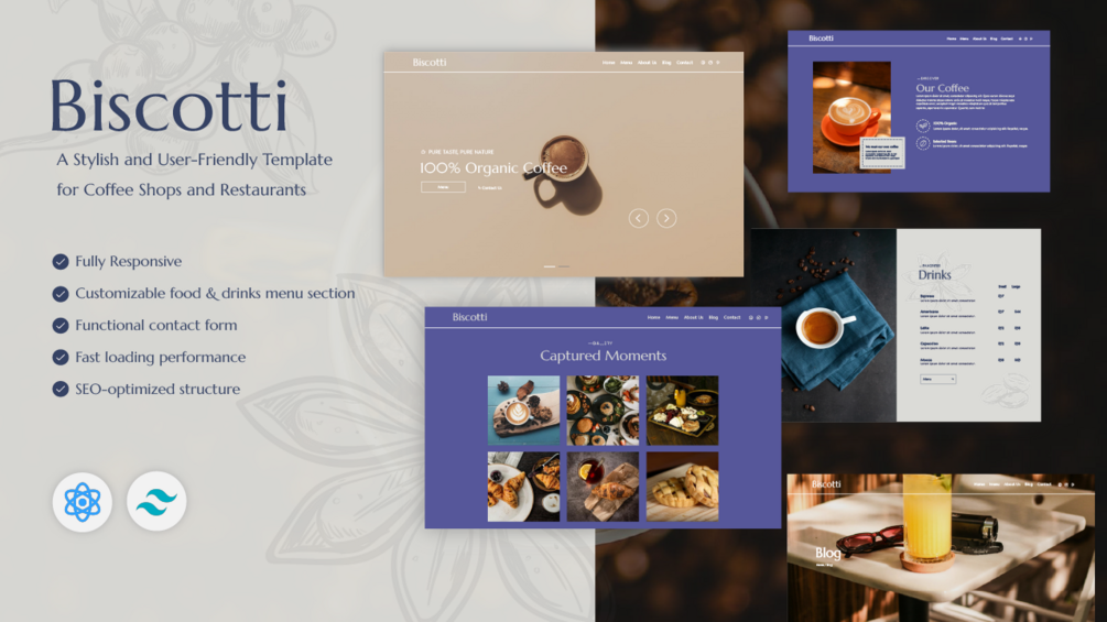 Biscotti is the perfect solution for business owners looking to create a beautiful, fast, and modern coffee shop or restaurant website using React and Tailwind CSS.